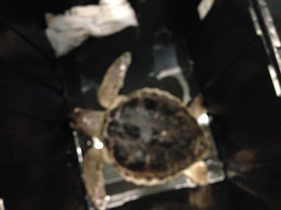 Late Sunday morning call came in about a turtle hooked off the Apache Pier. Quick trip down, sure enough, a very small Kemps. The manager of the Pier knew not to let anyone pull the turtle up onto the pier with the fishing line. Instead, he used one of the big drop nets and gently raised it. The turtle had two hooks in it's mouth. He was able to remove one hook, a flounder hook, which was superficially lodged in it's cheek. But the second was further in. Again, he knew not to yank it but to call for help. The turtle was immediately picked up and on it's way to the hospital, arriving around 2:30PM.